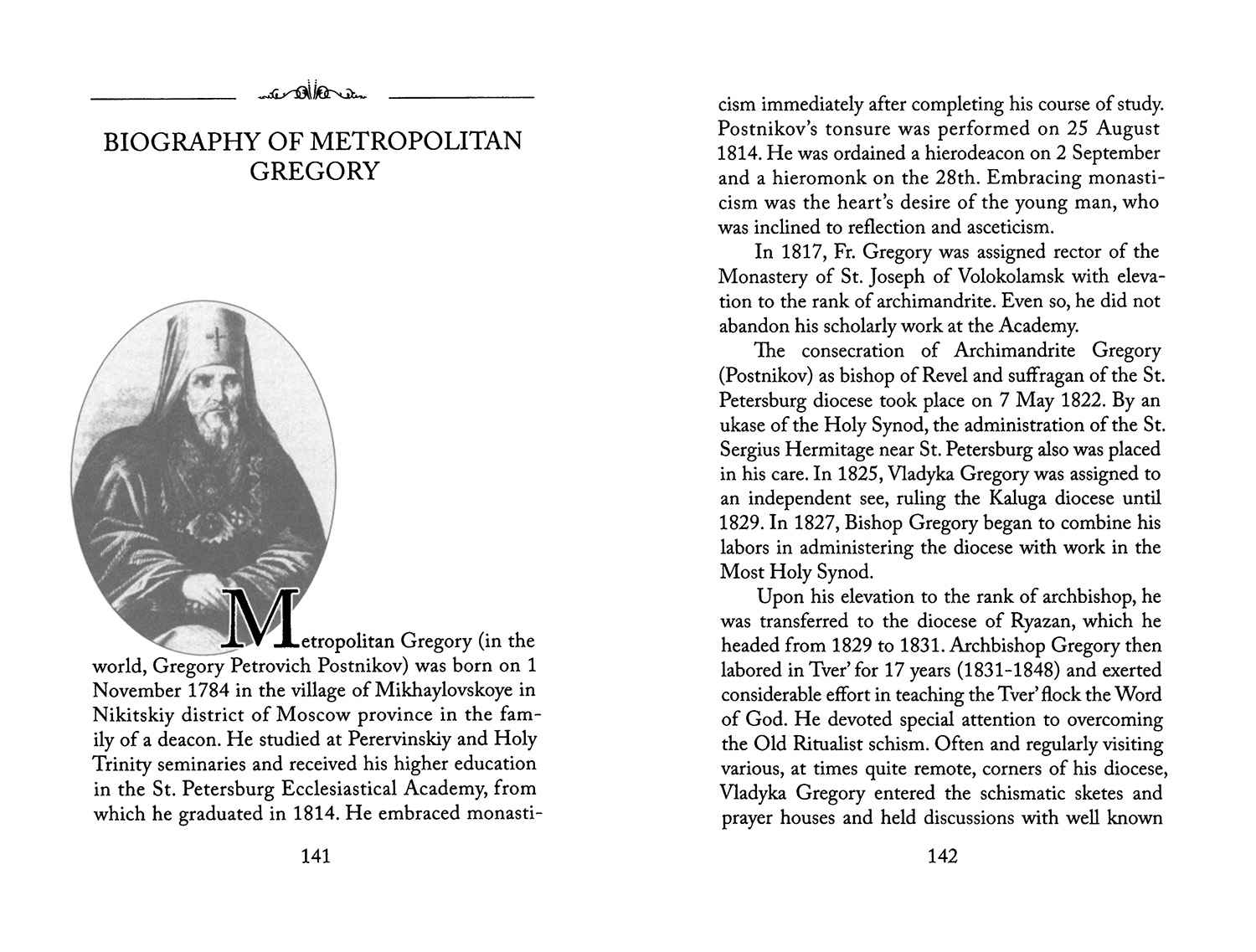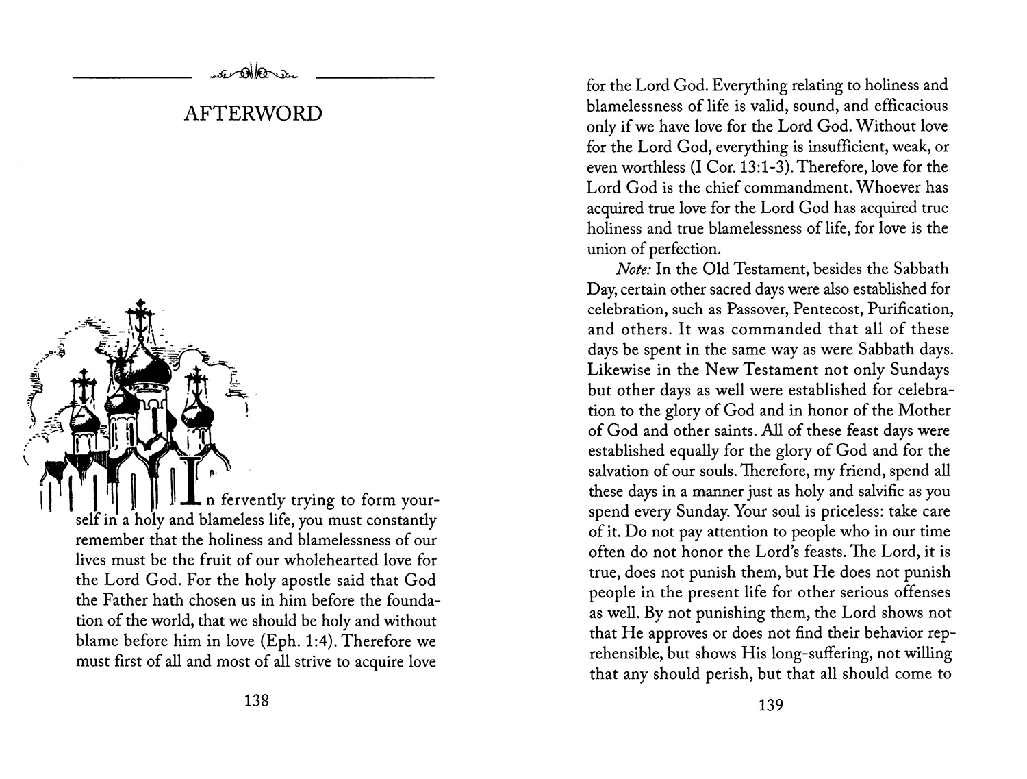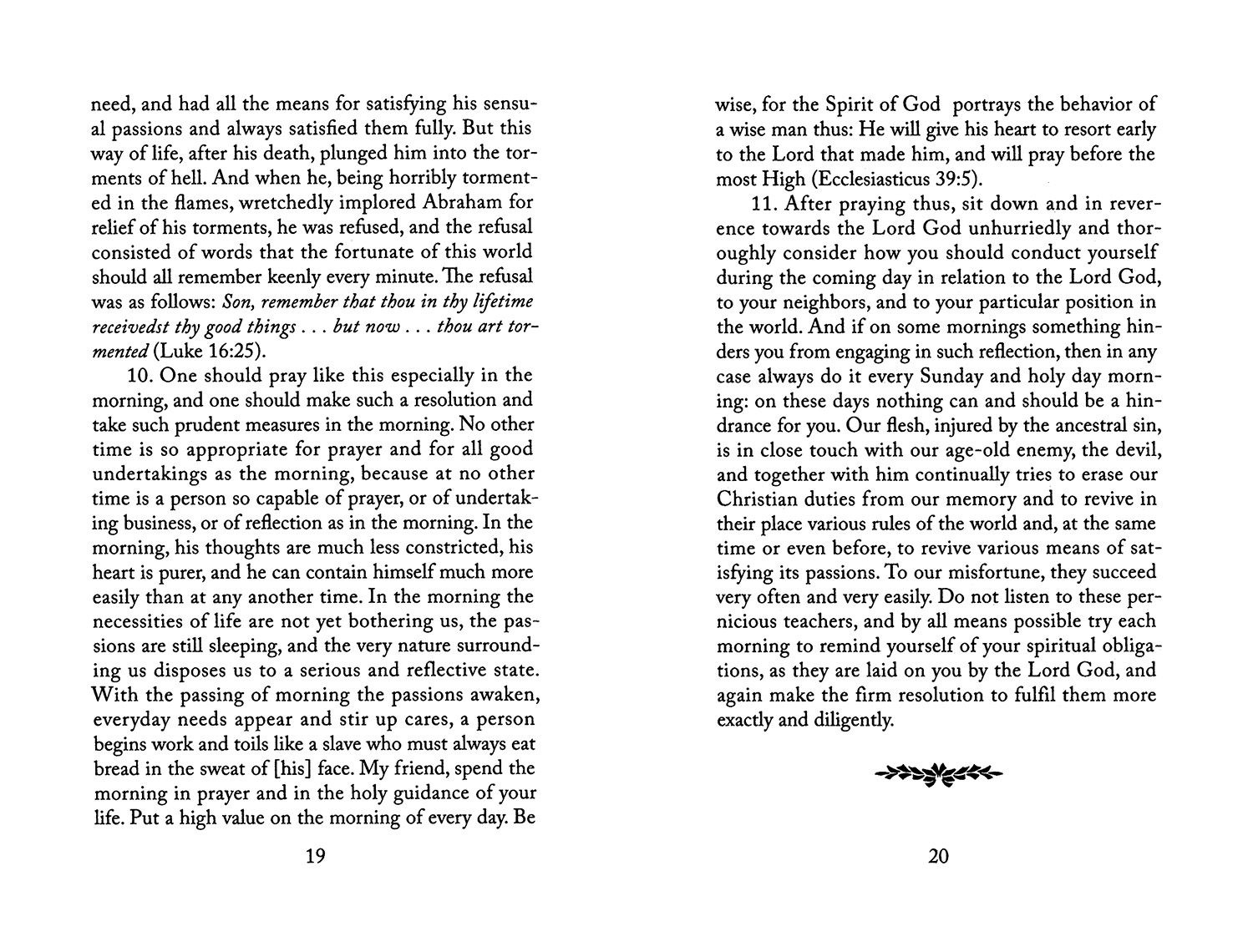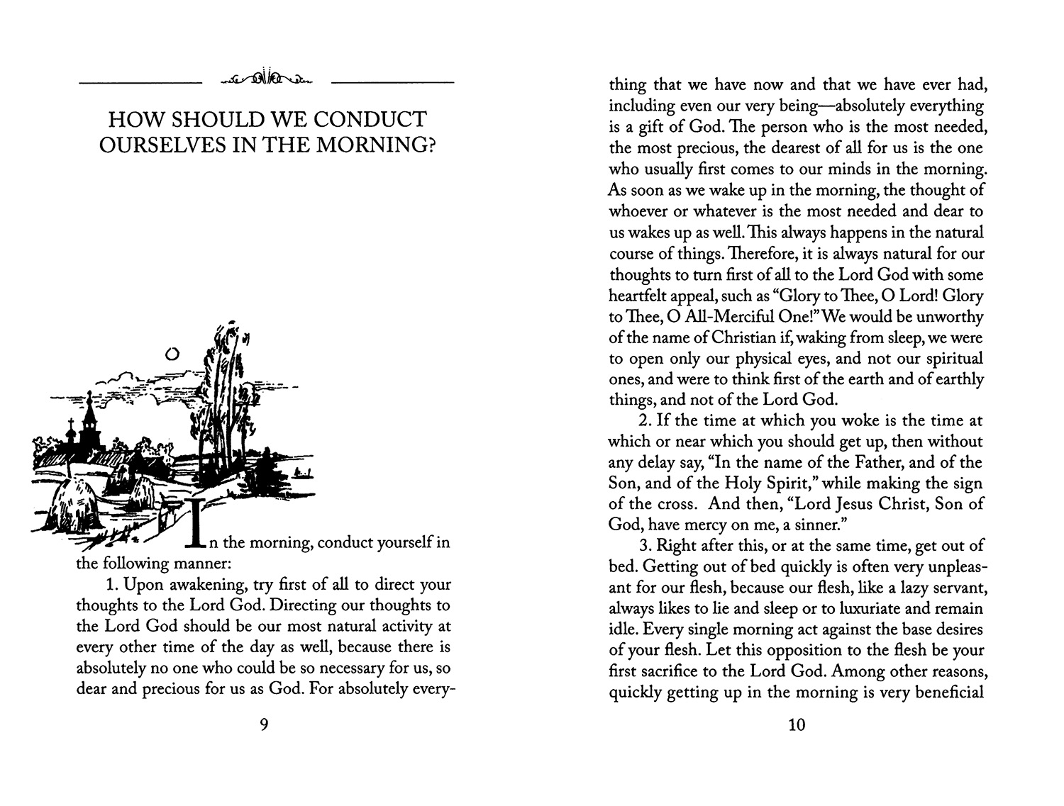 This pocket-sized book, originally published in Russian in 1904, is a short but comprehensive work offering guidance to the Orthodox Christian on how to conduct himself through the course of the day. Following an appeal to the reader, the author describes how one should conduct oneself in the morning, in relation to the Lord God, in common situations of life, in daily work, during meals, during the afternoon rest, in the evening, before sleep, and during sleeplessness. The author concludes with a consideration of prayer and guidance on how to spend Sundays. A biography of the author, Metropolitan Gregory (Postnikov) of St. Petersburg (1784-1860), concludes the work.