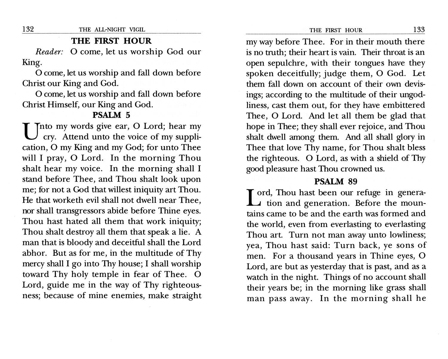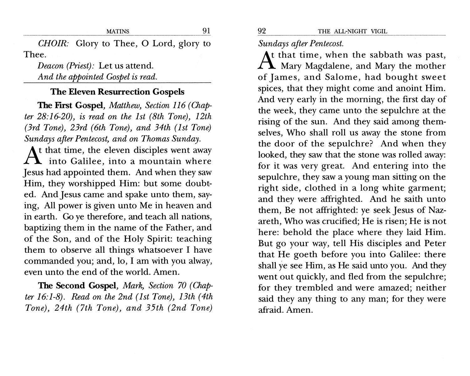 This is intended both to help the worshipper to follow the service at the Vigil for Sunday held on Saturday night and to assist the choir in chanting the service. It contains the unvarying texts and rubrics regarding the insertion of the variable parts. The parts of the priest, deacon, reader and choir are clearly indicated. No musical notation is included. Traditional English language is used throughout.
