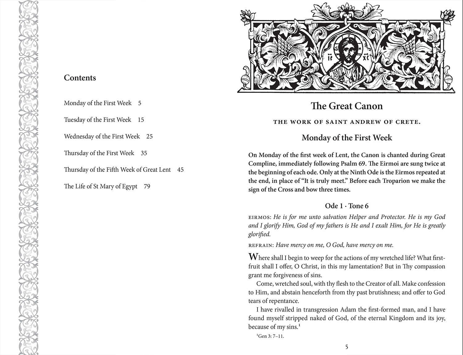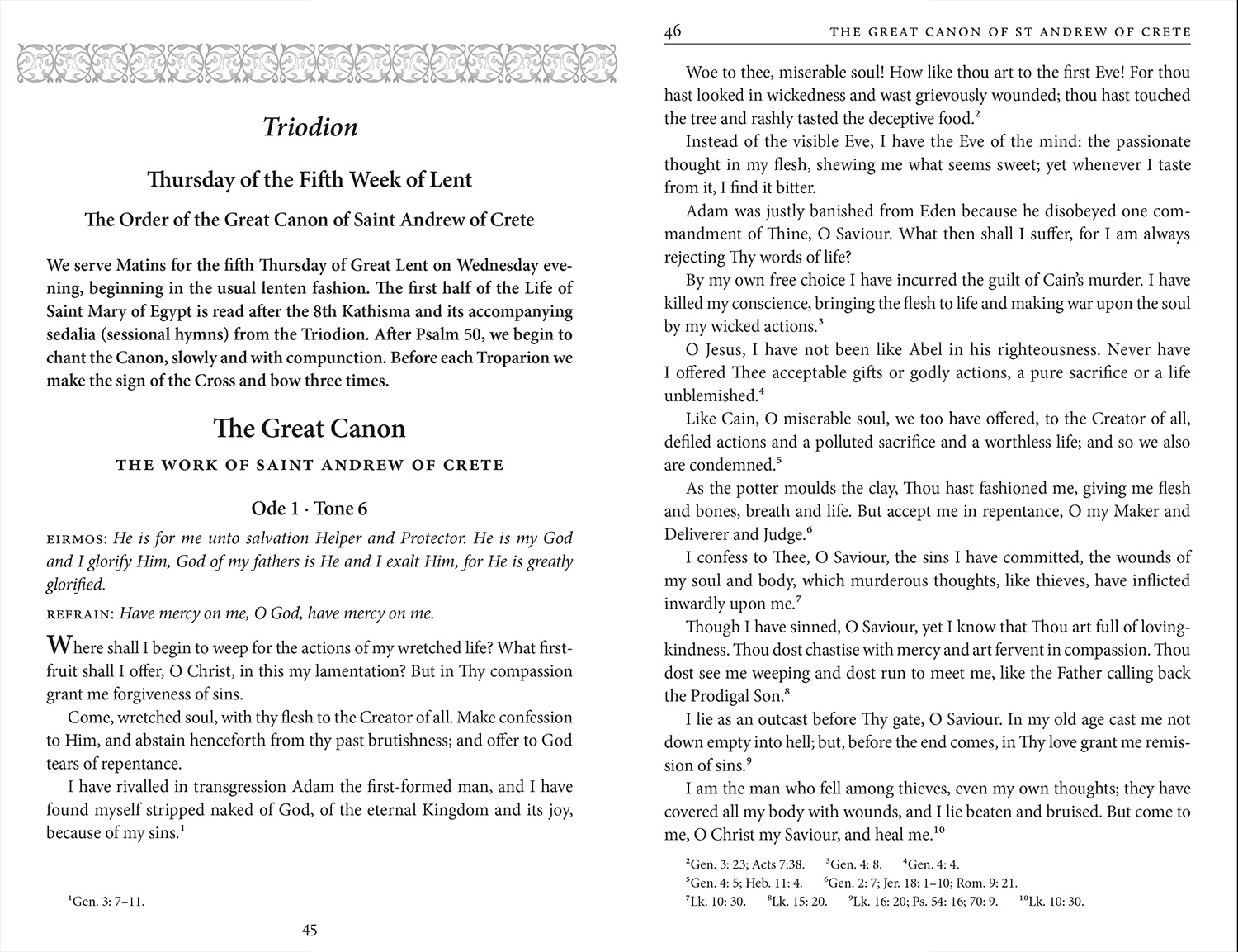 This second edition replaces ISBN 9780884651192. It uses the traditional English translation of Kallistos Ware and Mother Mary. It is the classic canon of repentance, chanted in during Lent and includes the Life of Mary of Egypt.